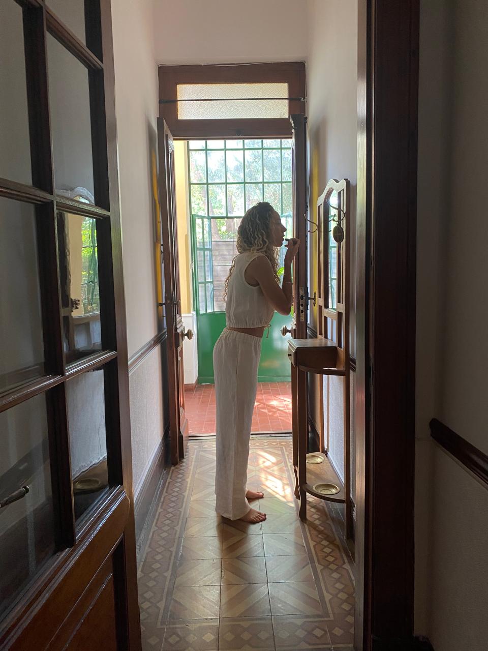 Pantalón de Lino con bolsillos y elástico en la cintura.